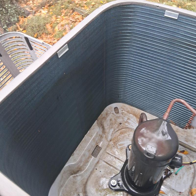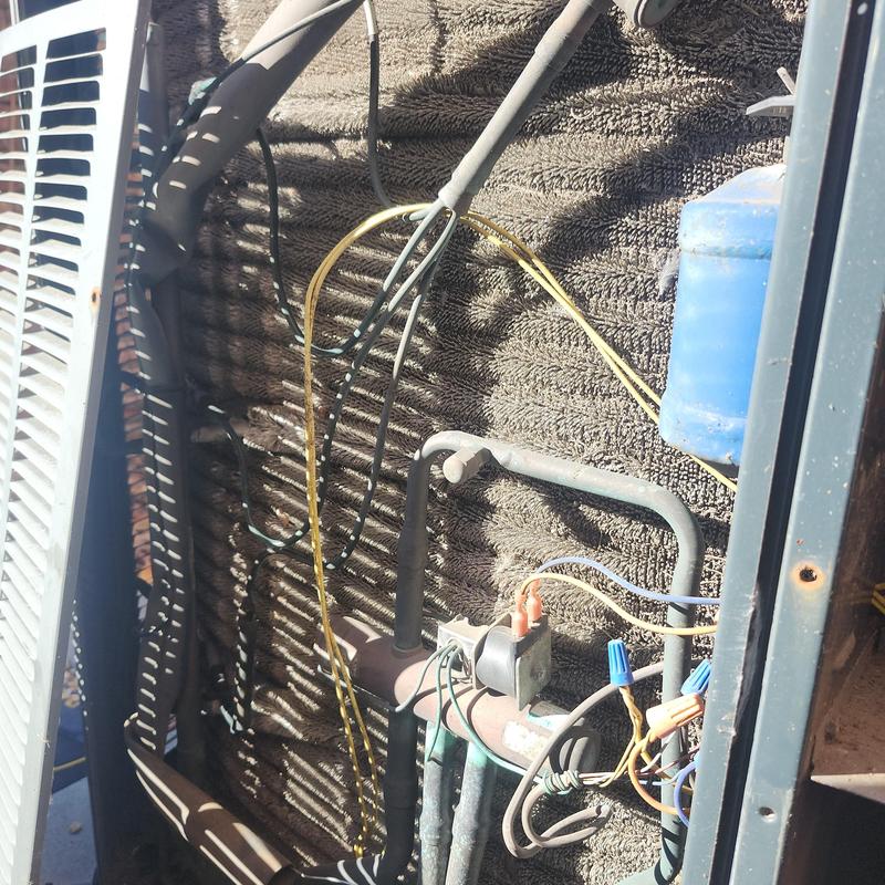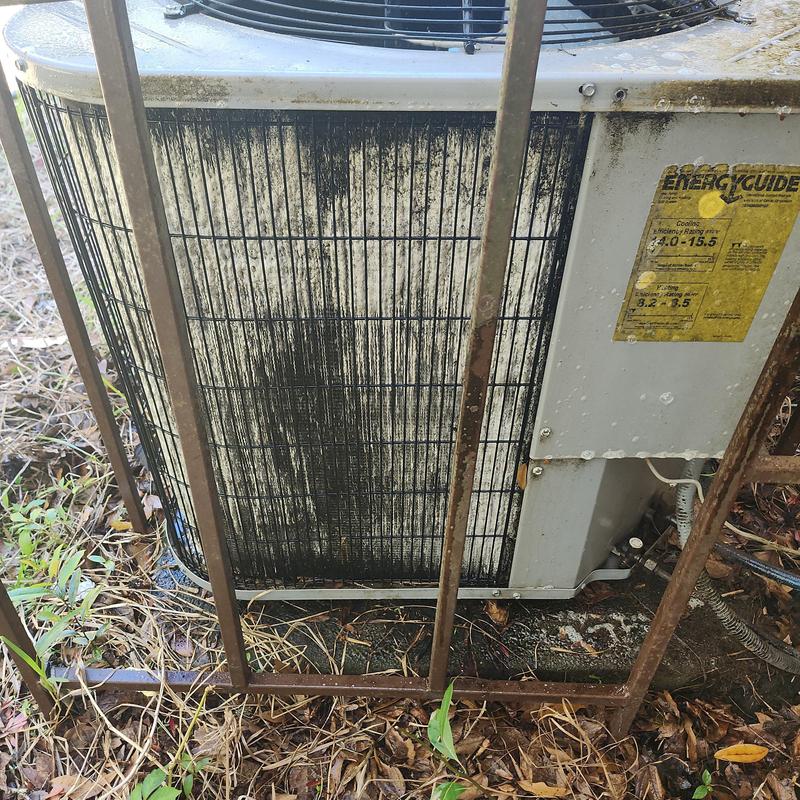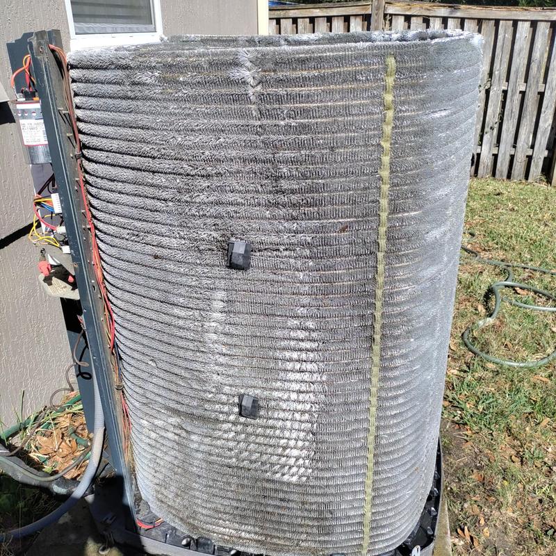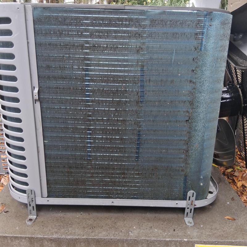A technician in Orange Park, Florida inspected an HVAC unit and found a clogged condenser coil needing deep cleaning. The technician also inspected the attic ductwork and electrical parts. A faulty thermostat was replaced. After testing, the system now heats correctly. A condenser coil deep cleaning is recommended to maintain performance.