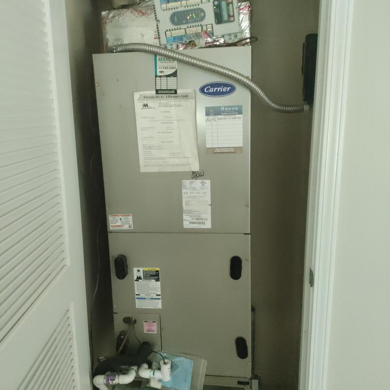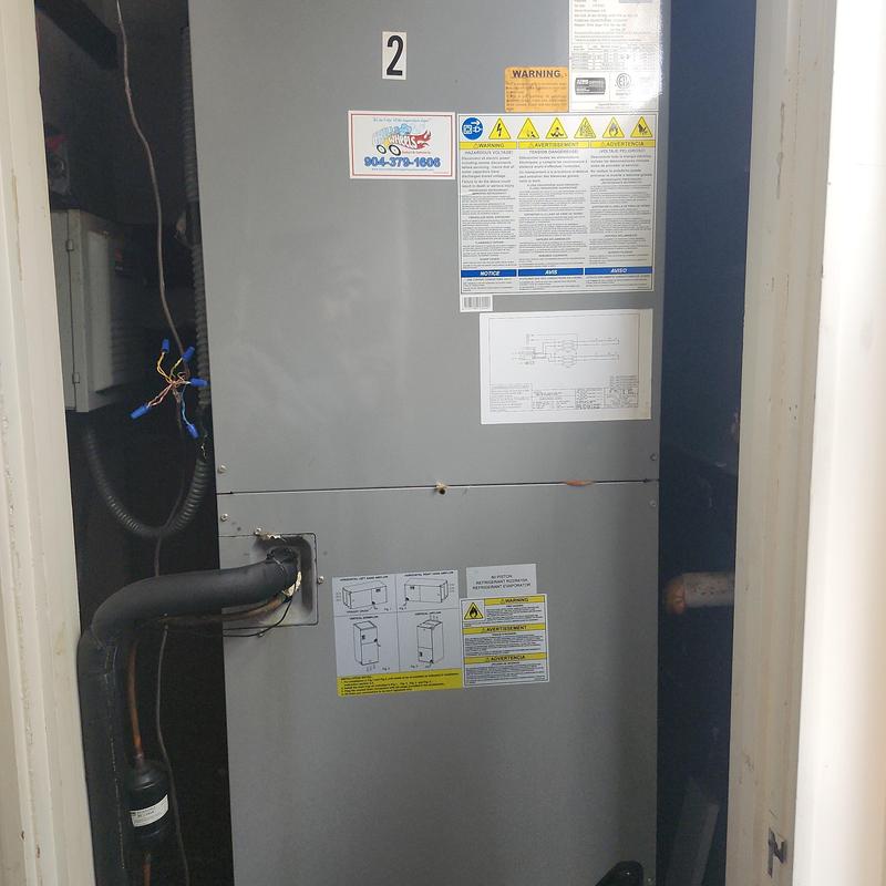 Chills on Wheels Heating and Air Contractors Inc replaced an air handler system in Jacksonville, FL. They removed the old unit and concrete pads, installed new copper lines with filters, extended electrical wiring, assembled the new air handler inside a closet, and performed a full system test.