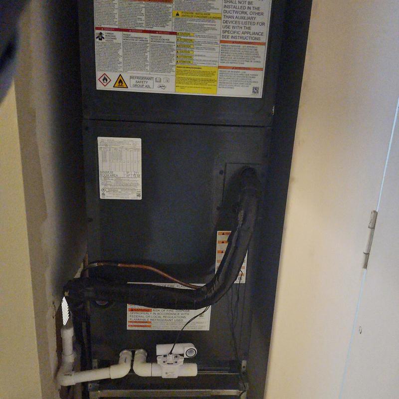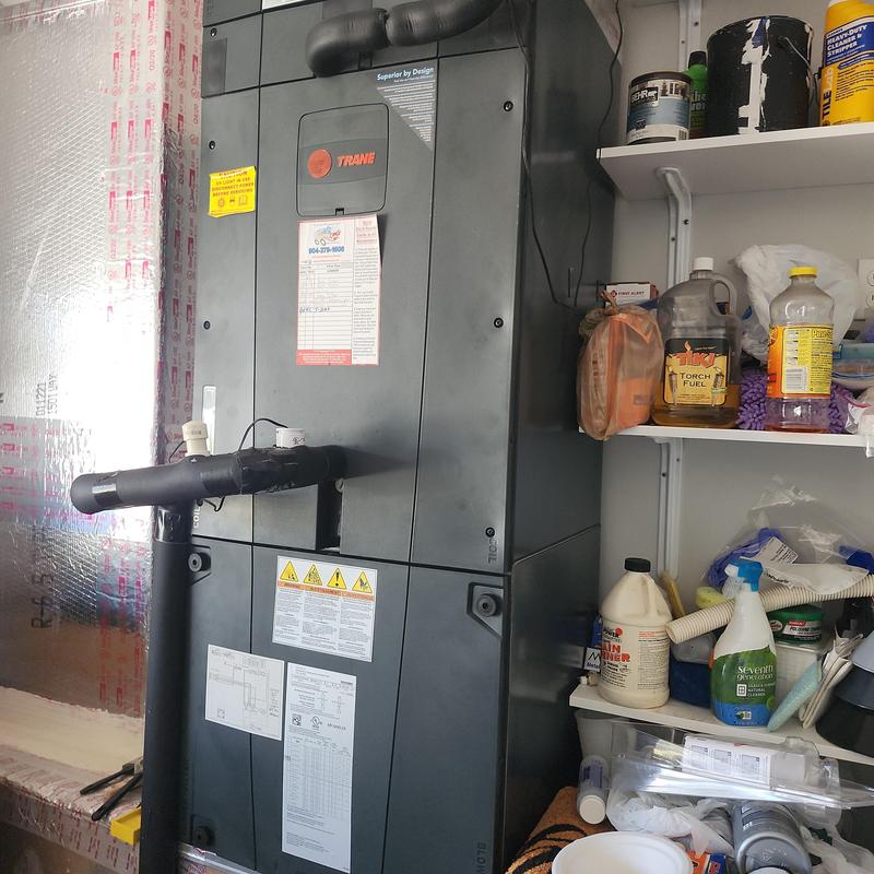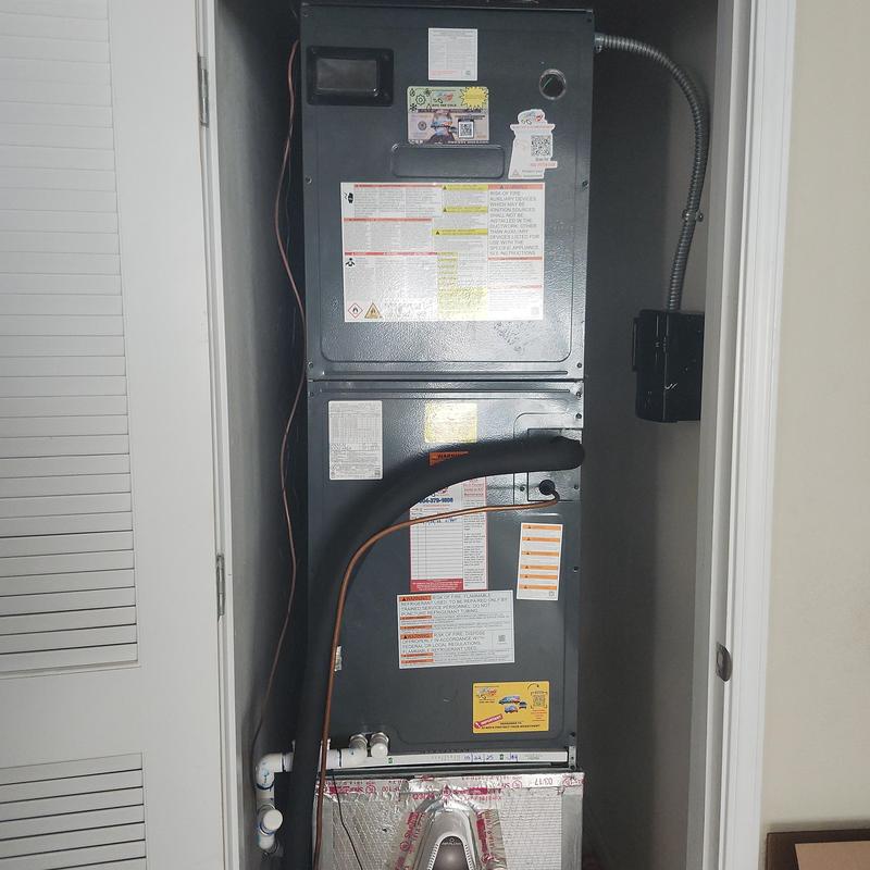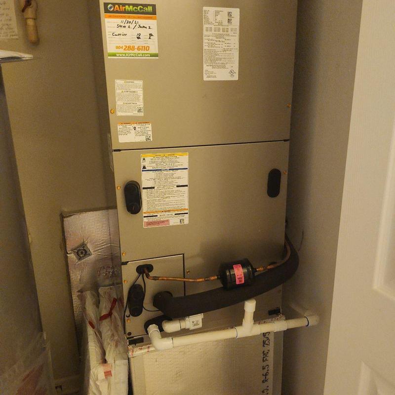 Chills on Wheels Heating and Air Contractors Inc installed a front-draw HVAC system above a water heater in a second-floor unit in Jacksonville, FL. The project included running new copper lines through the first-floor chase, adding Armaflex insulation, thermostat wiring, and R-410A refrigerant, and coordinating sprinkler system drainage.