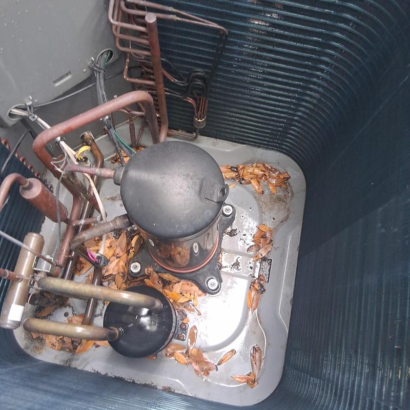 Chills on Wheels Heating and Air Contractors Inc inspected a 20-year-old 5-ton, 3-phase HVAC unit in Jacksonville, FL. They found a blown compressor and a damaged evaporator coil. They recommend a full system replacement due to the unit's age and condition.