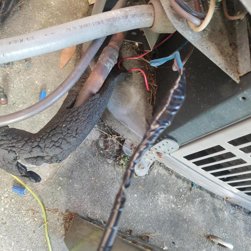 Chills on Wheels Heating and Air Contractors Inc fixed a short circuit on a high voltage whip in a heating and air system in Jacksonville, Florida. They cut off damaged wire tips and spliced the wires to restore proper system function.