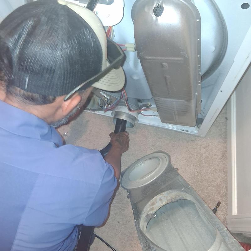 Chills on Wheels Heating and Air Contractors Inc cleaned and vacuumed the dryer vent and duct system in Jacksonville, FL. They moved the dryer, removed and cleaned the transition tubing, vacuumed the vent port and lint trap, then reconnected all components for a fully cleaned system.