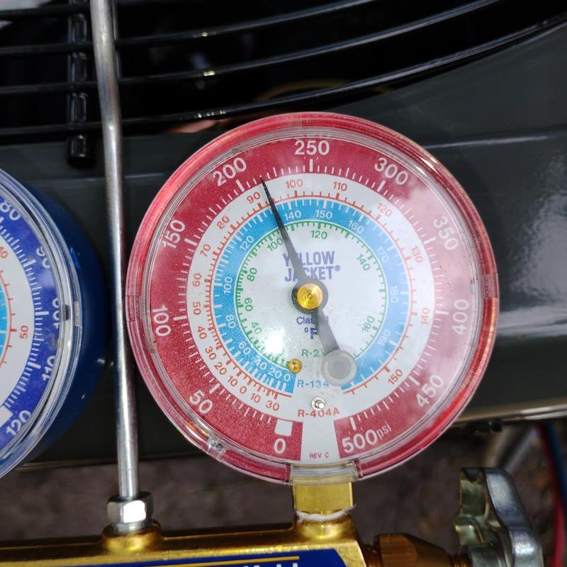 An HVAC technician in Jacksonville, Florida replaced a faulty capacitor and inspected system pressure. They found high liquid line pressure and low suction pressure, indicating a refrigerant leak. Although the system is cooling, its performance is insufficient due to low refrigerant levels, suggesting the need for further diagnostics and repair.