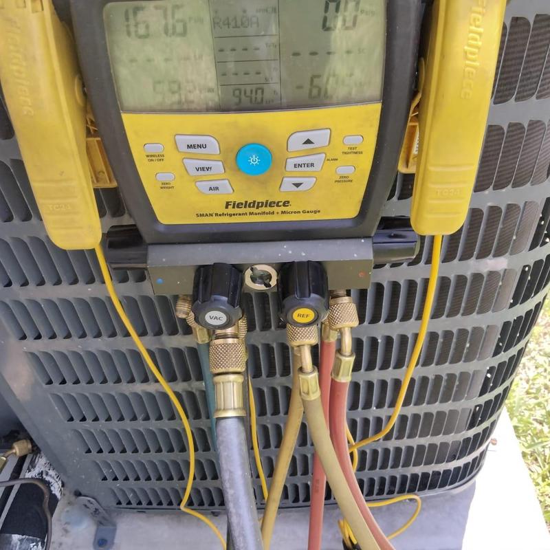 Technicians in Middleburg, Florida charged an HVAC system with three pounds of R410A refrigerant and found a refrigerant leak in the indoor coil. The service addressed low refrigerant levels and identified a leak affecting system performance.