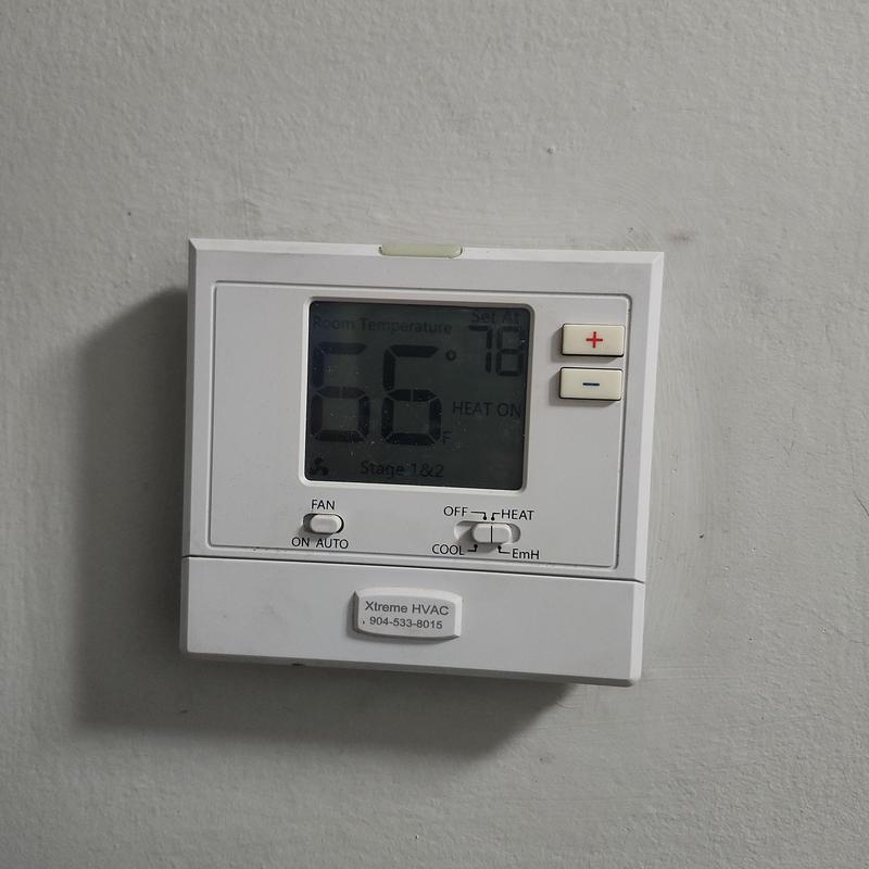 Chills on Wheels Heating and Air Contractors Inc replaced a faulty thermostat and installed a new air filter during a heating system inspection in Jacksonville, Florida. The team confirmed the unit functions correctly in heat mode. Due to lack of attic access, a full duct inspection was not completed. Future access may be required to check insulation and duct integrity.