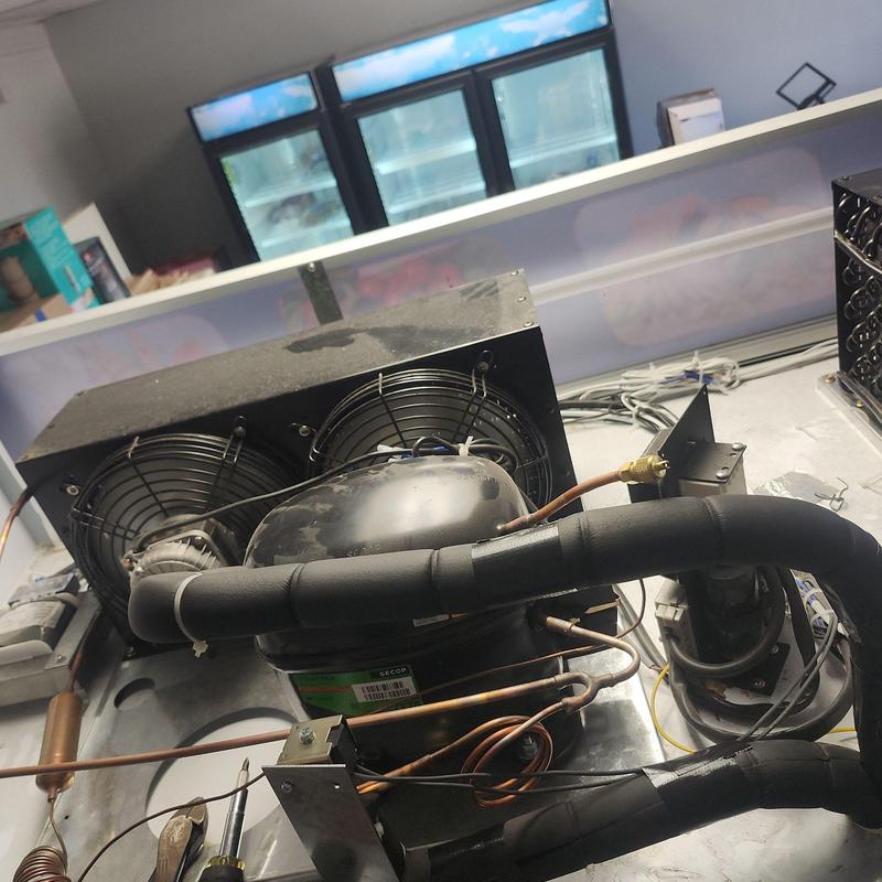 Chills on Wheels Heating and Air Contractors Inc serviced a refrigeration system in Jacksonville, Florida. They removed the base valve, flushed the system with nitrogen, installed new quarter-turn valves, performed a nitrogen pressure test, evacuated the system below 400 microns, charged it with R-404a, and confirmed proper operation.