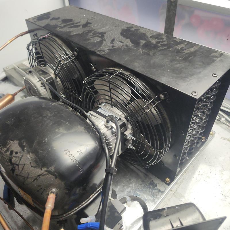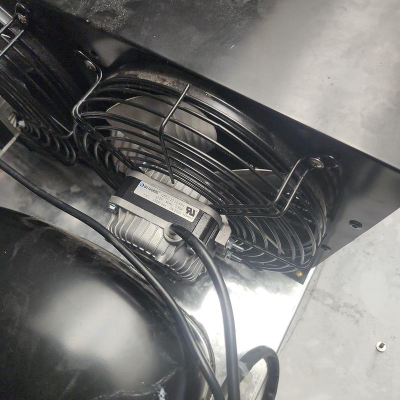 Technicians in Jacksonville, Florida inspected a non-functioning cooler unit. They lubricated locked fan motors and identified the need to replace both motors and capacitors. They also found blocked refrigerant access valves, a low 404A charge, and a damaged kitchen door affecting temperature control. Recommended repairs include motor replacements, valve replacement, refrigerant refill, and door repair.