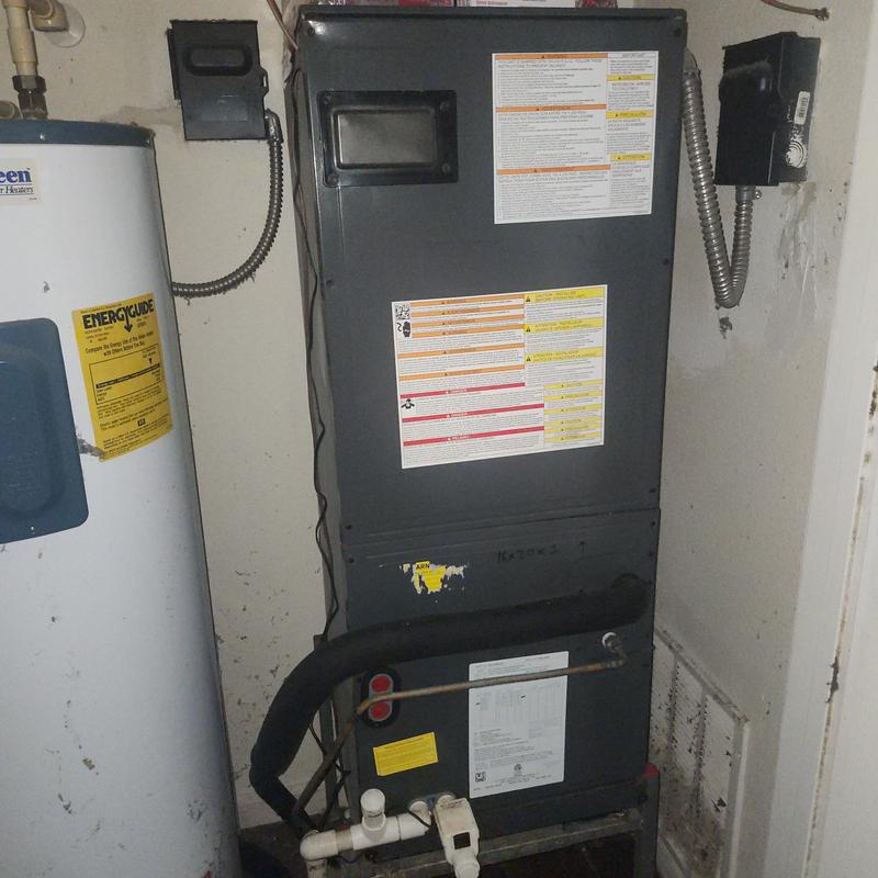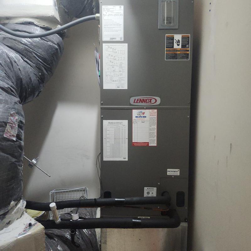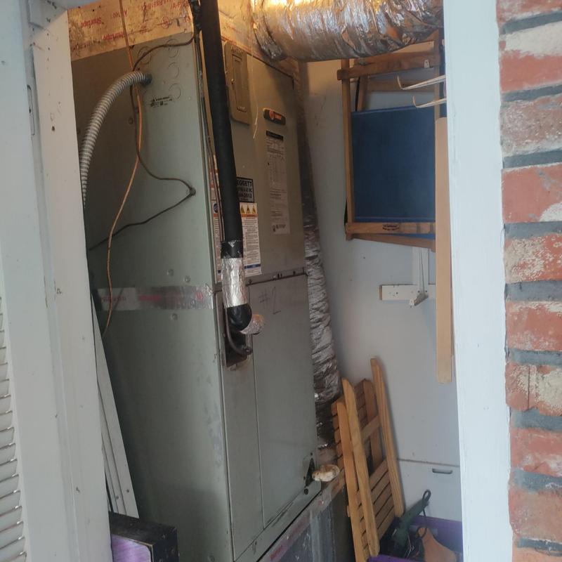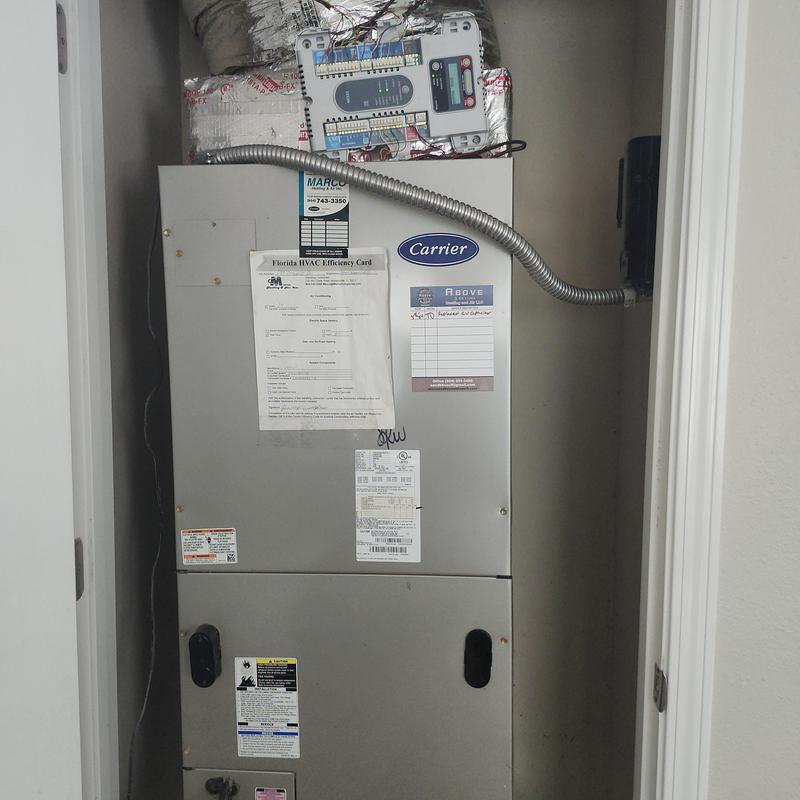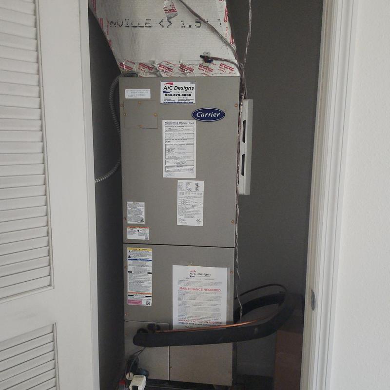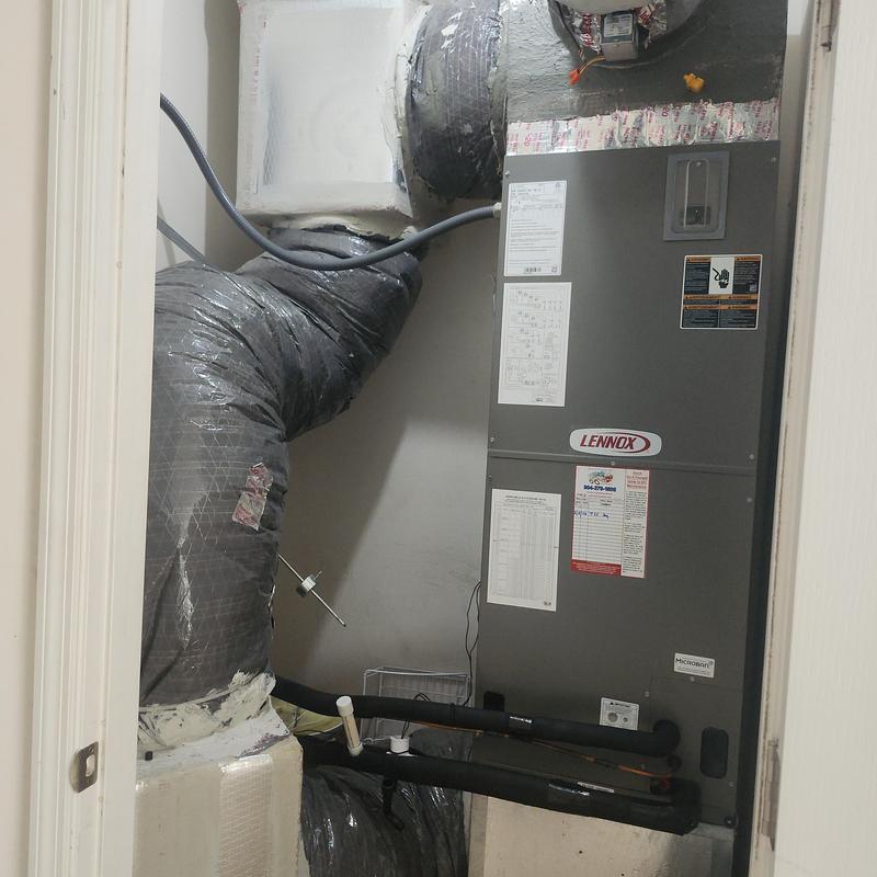 Chills on Wheels Heating and Air Contractors Inc replaced an air handler system in Jacksonville, FL. They removed the old unit and concrete pads, installed new copper lines with filters, extended electrical wiring, assembled the new air handler inside a closet, and performed a full system test.