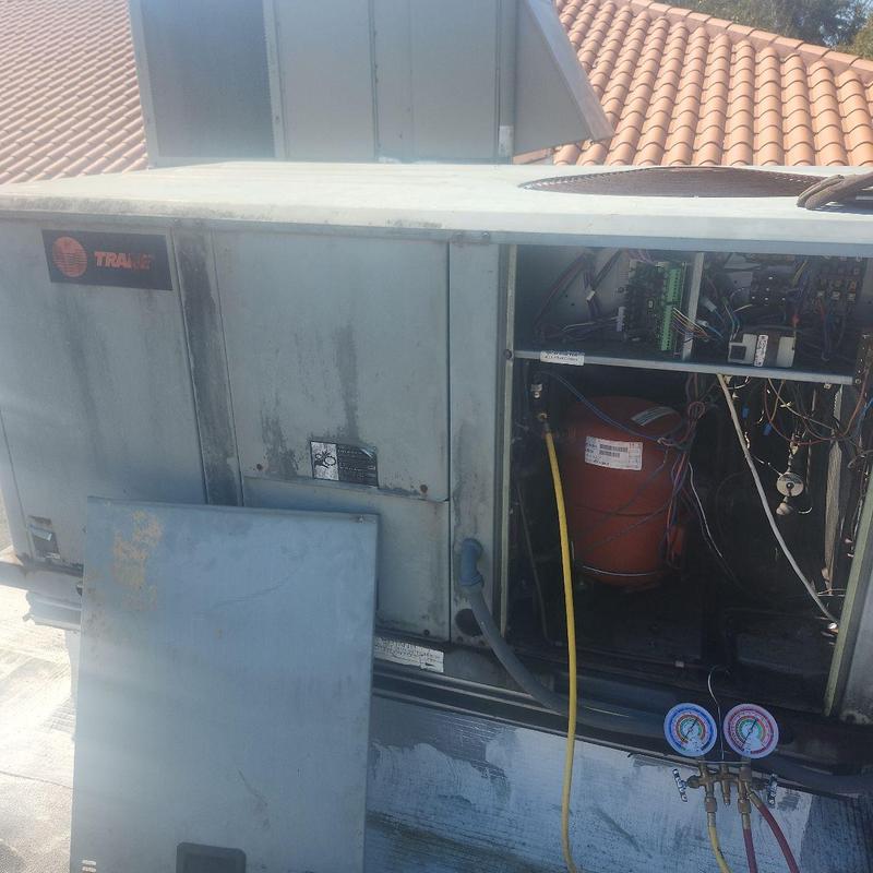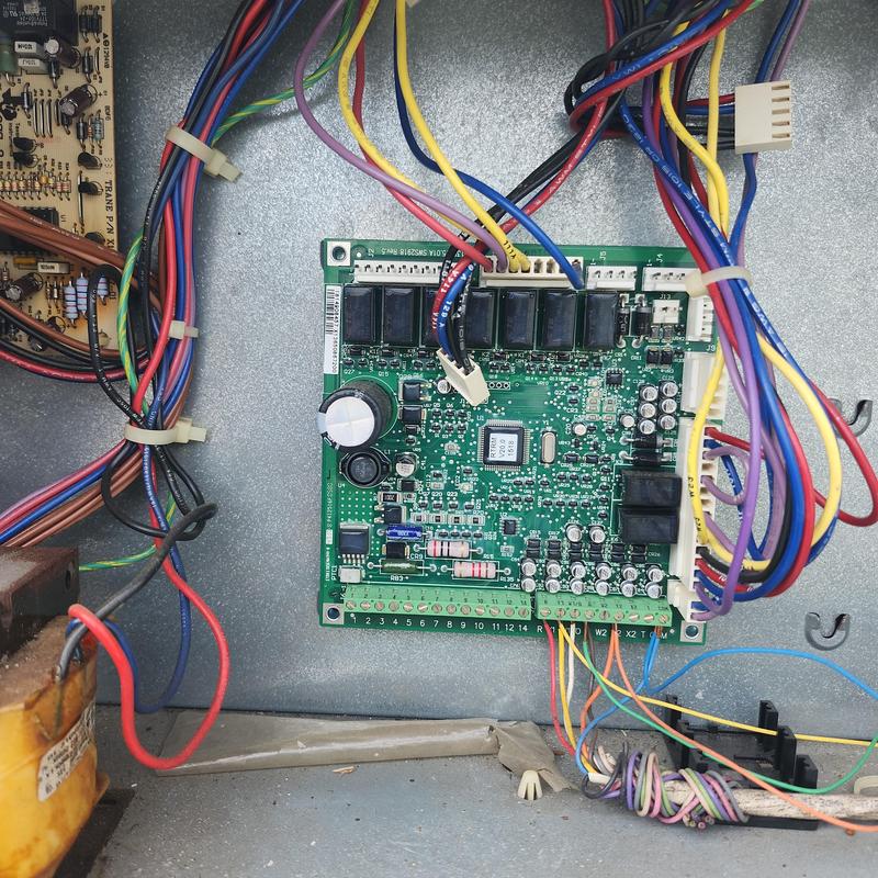 HVAC technicians in Jacksonville, Florida replaced a faulty main board and handled complex rewiring for a rooftop unit. One technician worked on the roof while another managed wiring below. The team coordinated to restart the system and conduct a follow-up inspection, with additional parts planned based on system performance.
