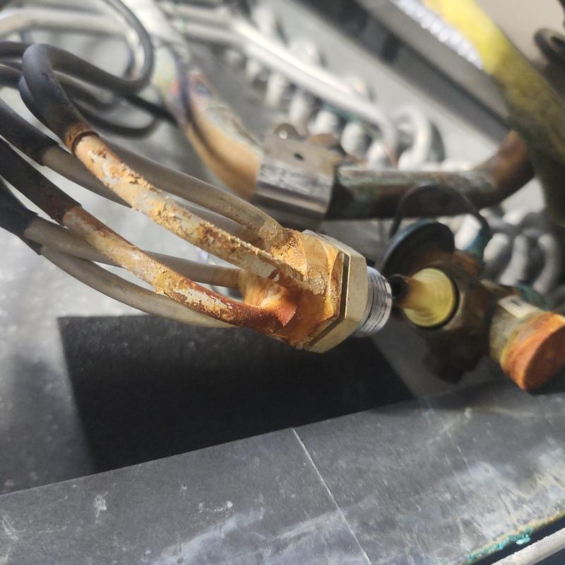 Chills on Wheels Heating and Air Contractors Inc inspected an unresponsive thermostat in Jacksonville, FL, replacing a blown fuse. They identified stripped outdoor thermostat wiring, a dirty evaporator coil needing professional cleaning, and a refrigerant leak requiring a full leak search and repair. Repairs or system replacement are advised.