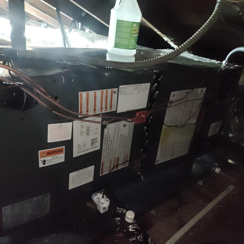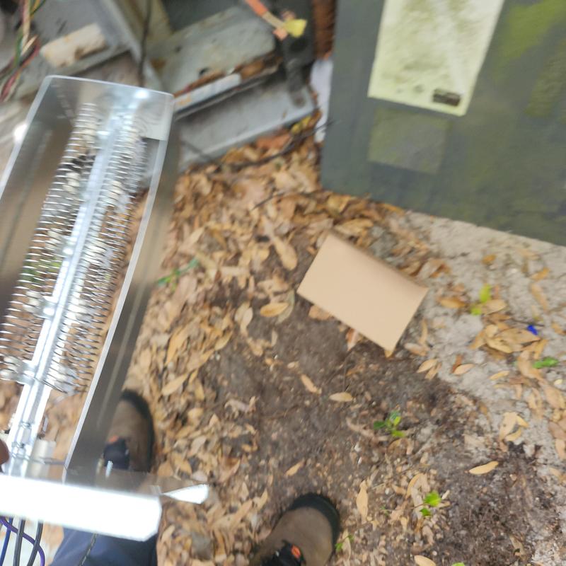 A technician in Orange Park, Florida inspected an HVAC unit and found a clogged condenser coil needing deep cleaning. The technician also inspected the attic ductwork and electrical parts. A faulty thermostat was replaced. After testing, the system now heats correctly. A condenser coil deep cleaning is recommended to maintain performance.