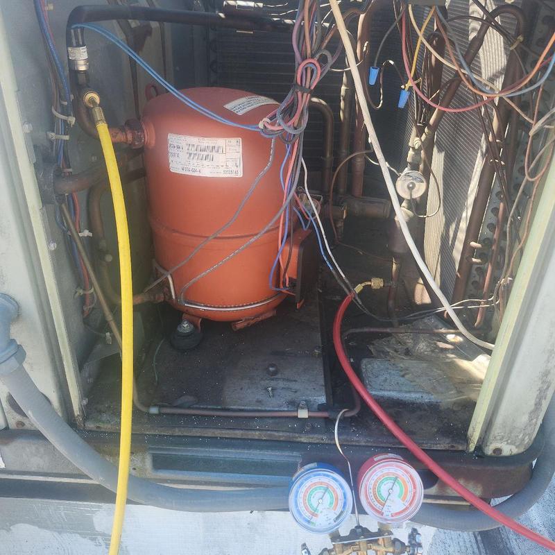 Chills on Wheels Heating and Air Contractors Inc completed a rooftop HVAC service in Jacksonville, Florida. Technicians replaced the compressor, added Acid Away, installed a bi-flow filter dryer and new contactor, pulled a vacuum below 400 microns, charged the system, and verified proper cooling operation.