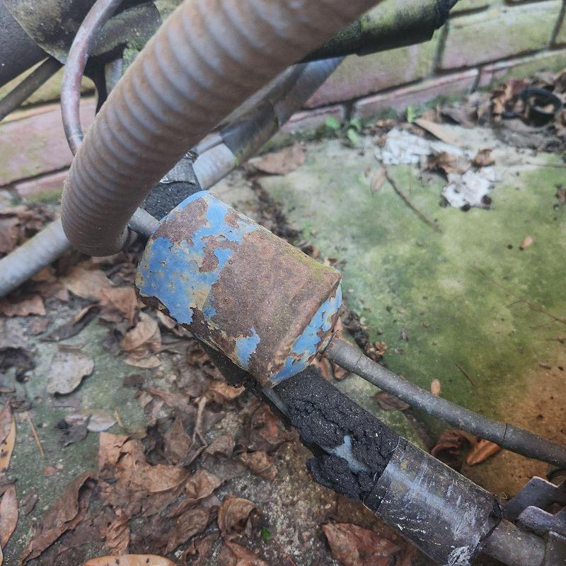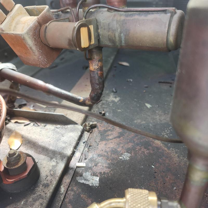 Chills on Wheels Heating and Air Contractors Inc inspected an HVAC unit in Jacksonville, FL, finding no refrigerant and two leaks: one at the compressor and another on the high-side line. The unit shows significant corrosion, and a full replacement is recommended to prevent further issues.