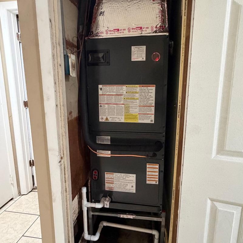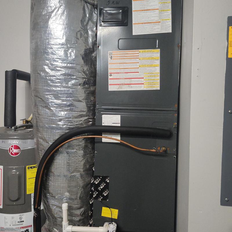 Chills on Wheels Heating and Air Contractors Inc installed a front-draw HVAC system above a water heater in a second-floor unit in Jacksonville, FL. The project included running new copper lines through the first-floor chase, adding Armaflex insulation, thermostat wiring, and R-410A refrigerant, and coordinating sprinkler system drainage.