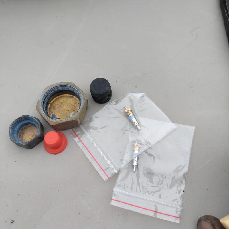 Chills on Wheels Heating and Air Contractors Inc inspected a condenser coil leak in Jacksonville, FL. They found a leak on the low-side service valve and previous improper leak lock application. They recommend replacing both service and Schrader valves, the filter dryer, and recharging the refrigerant accurately.