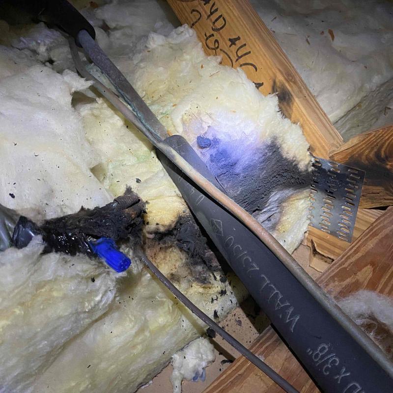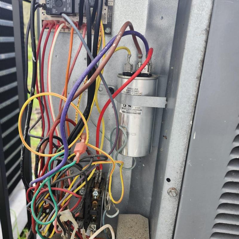 Chills on Wheels Heating and Air Contractors Inc installed a 3.5-ton, 14 SEER Trane heat pump split system in Orange Park, Florida. Technicians repaired three damaged high voltage wiring sections in the attic that prevented the condenser from starting. After repairs, the system began functioning properly.