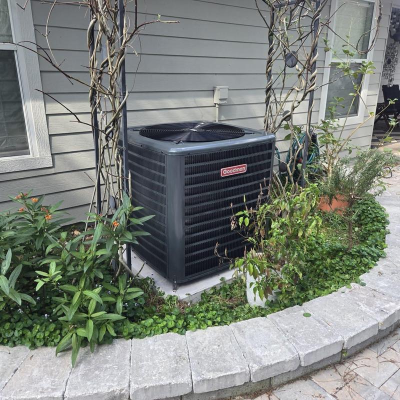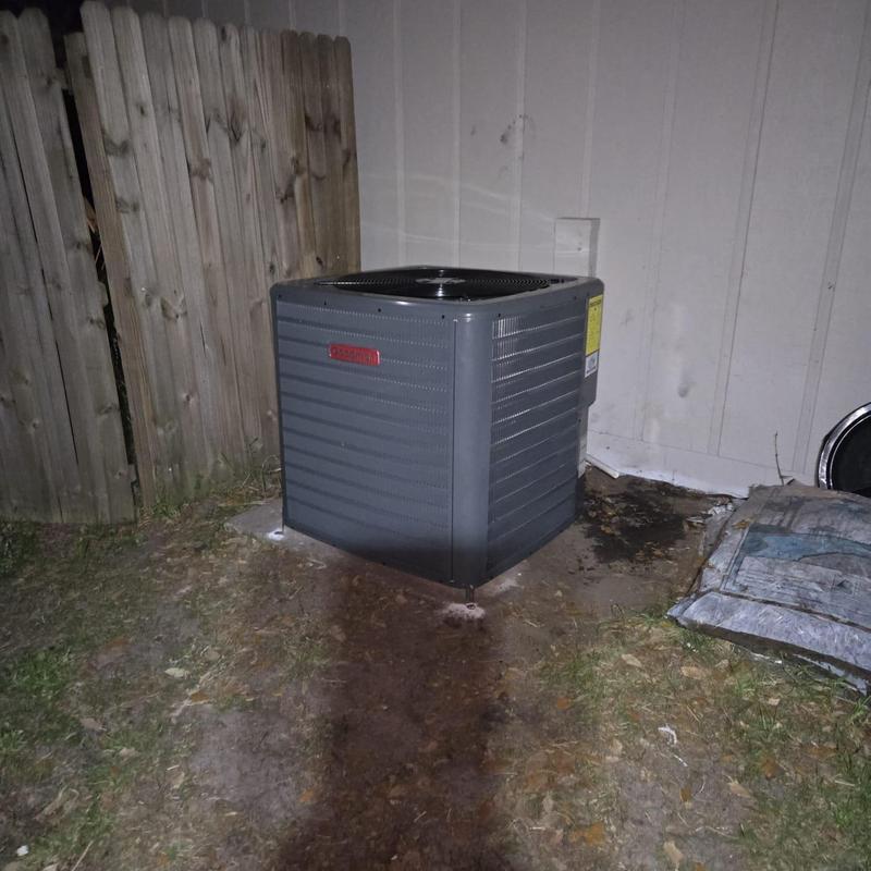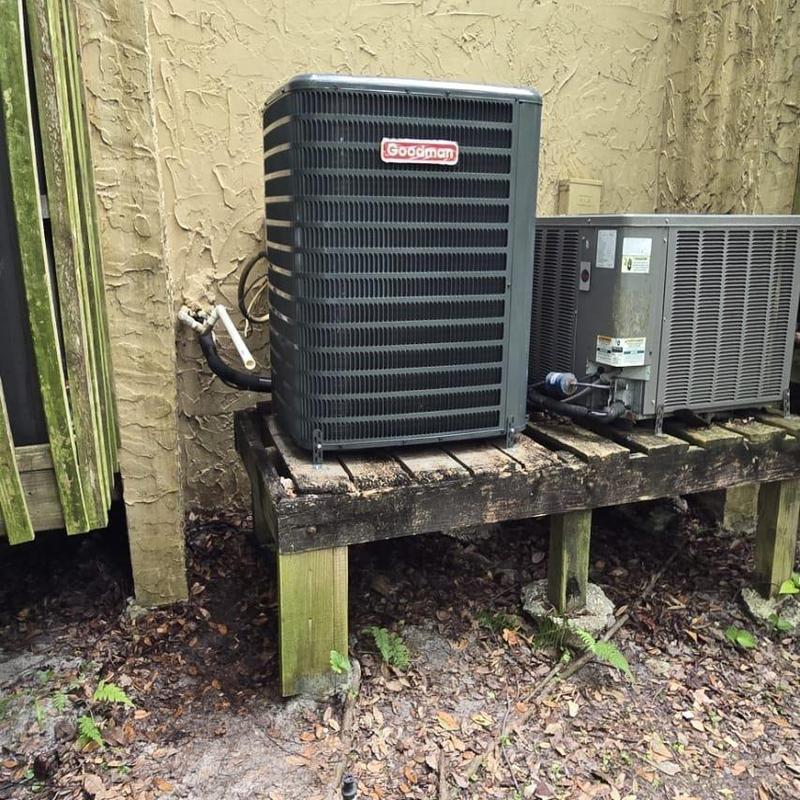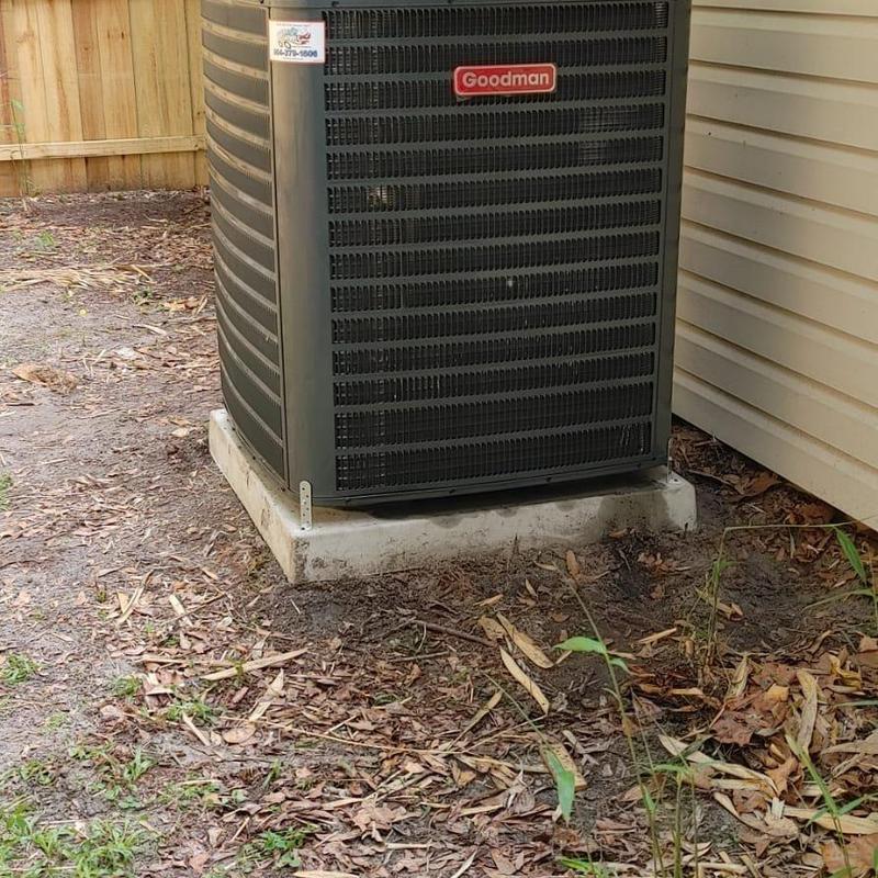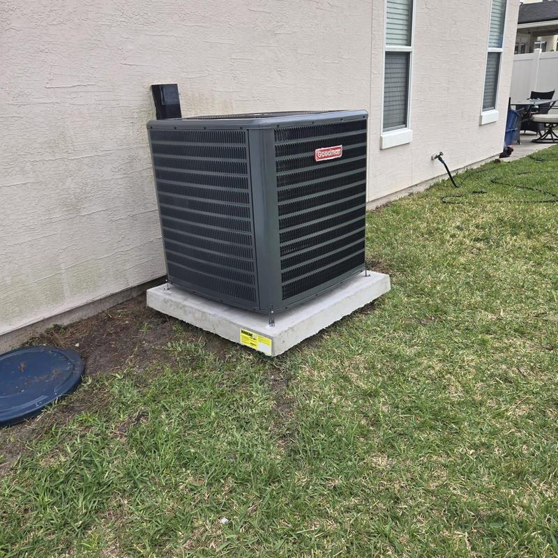 Chills on Wheels Heating and Air Contractors Inc installed a Goodman 3.5 Ton 14.5 SEER2 air conditioner split system in Jacksonville, Florida. The project included a new concrete pad, a new refrigerant line set, and a new thermostat for system control.