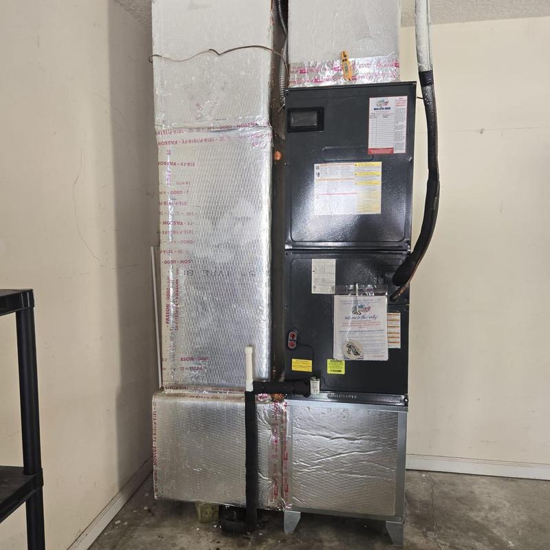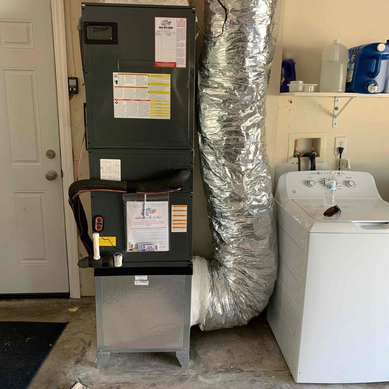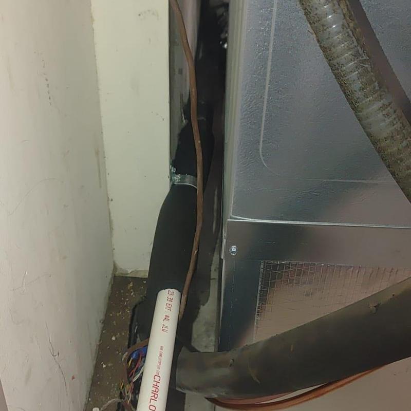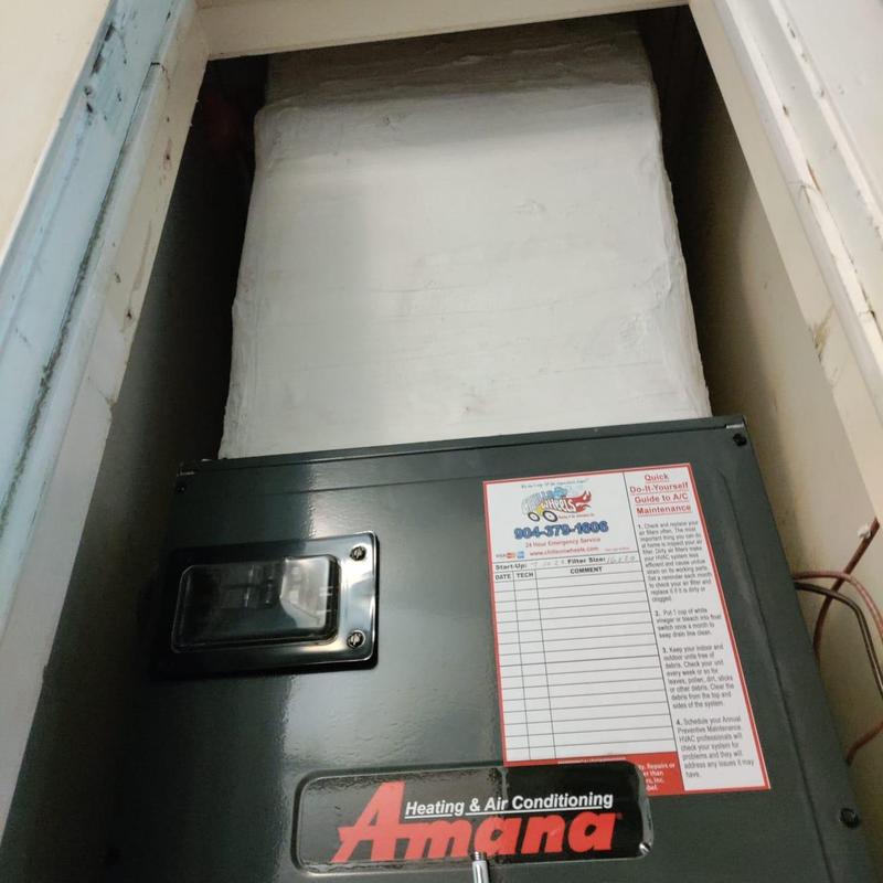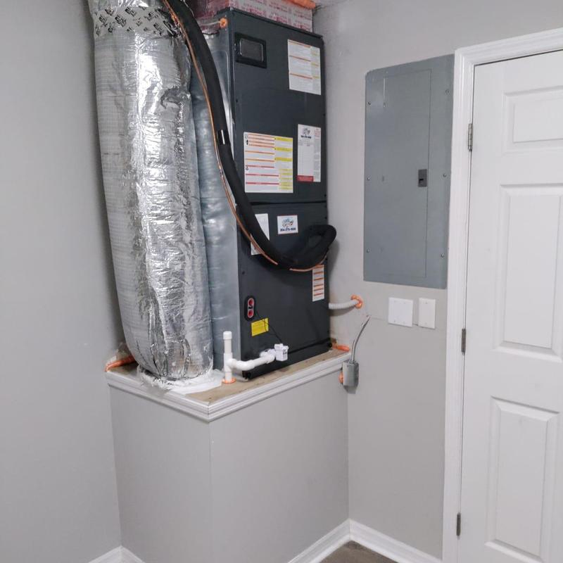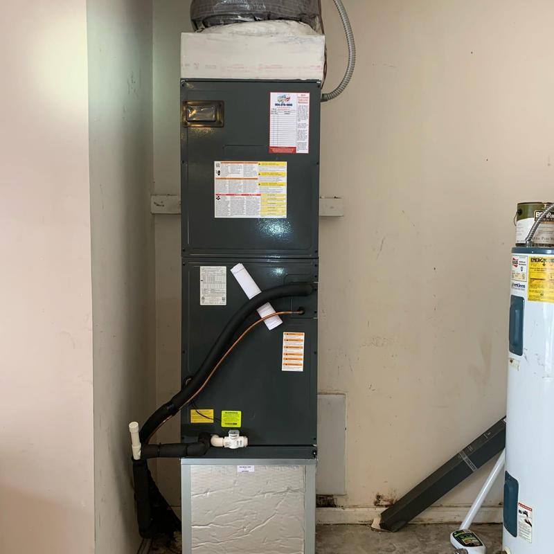 Chills on Wheels Heating and Air Contractors Inc replaced a damaged heat pump system in Orange Park, Florida. The team removed the old air handler and condenser, installed new refrigerant piping, drain line, thermostat, and emergency heater. They set a new condenser on a concrete pad with hurricane tie-downs and secured permits for inspection.
