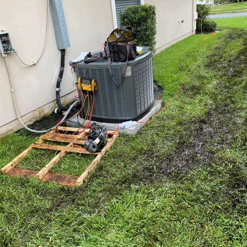 Chills on Wheels Heating and Air Contractors Inc replaced a damaged heat pump system in Middleburg, Florida. The team removed the old air handler and condenser, cleaned the refrigerant lines and drain, installed a new concrete pad, thermostat, heat pump condenser with tie-downs, and pulled permits for inspection.